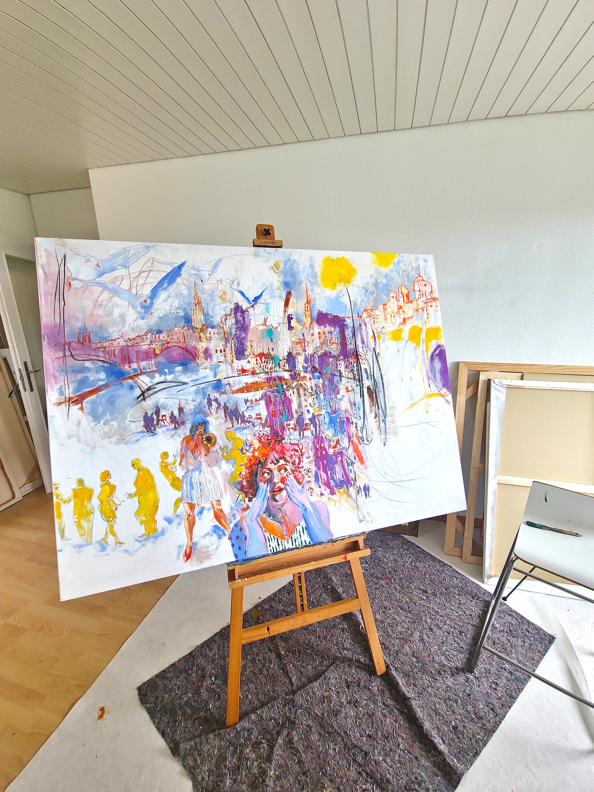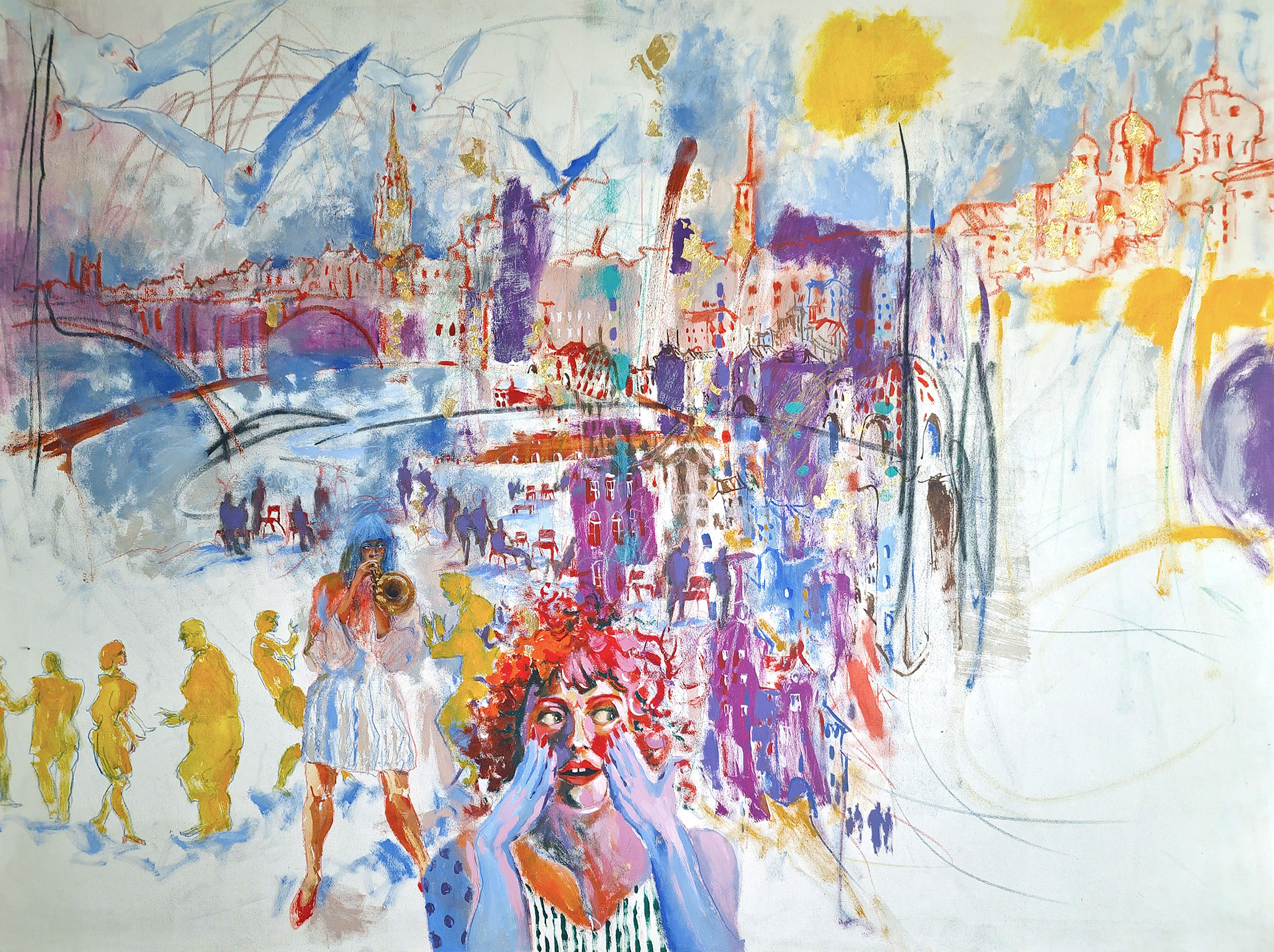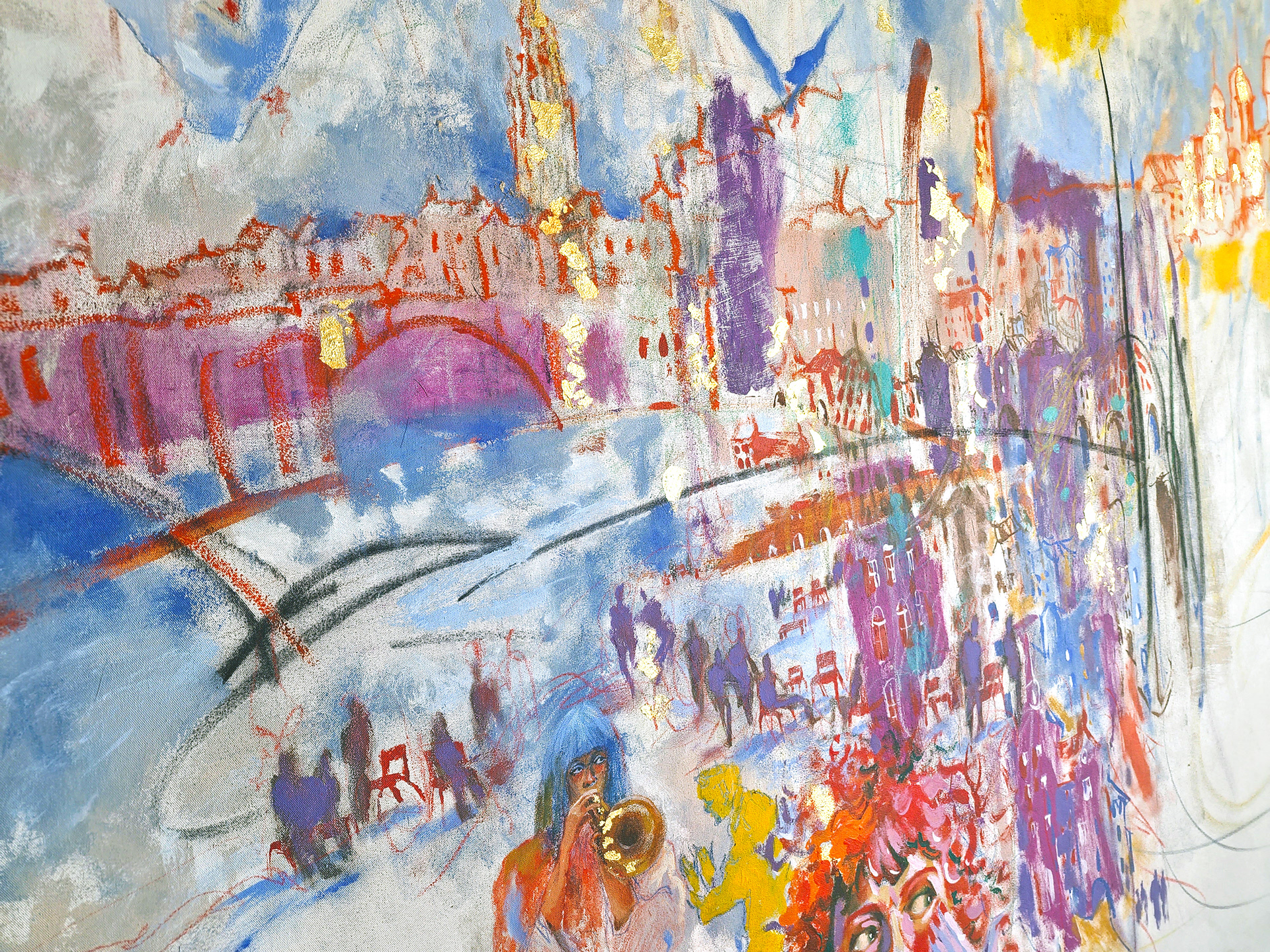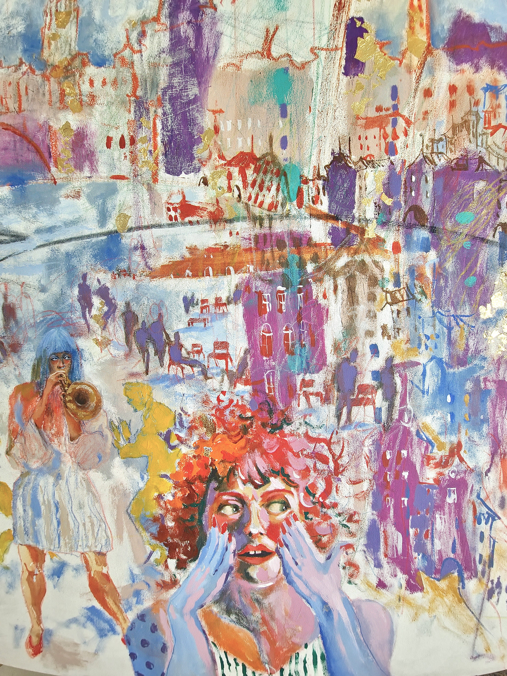 The image unfolds as a living field of movement, where architecture, sound, bodies, and air merge into one continuous flow. Lines remain open, colors vibrate, figures appear and dissolve, allowing the viewer to sense the process rather than a finished form.