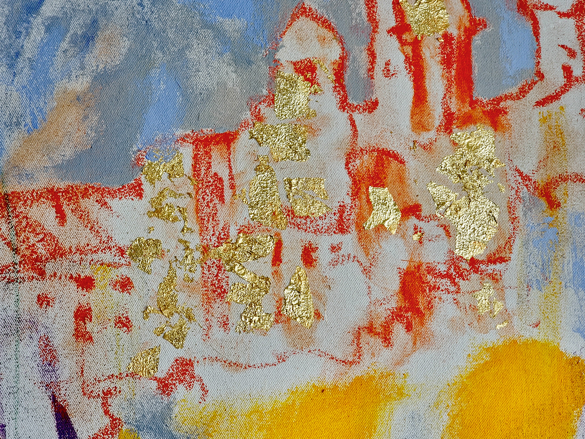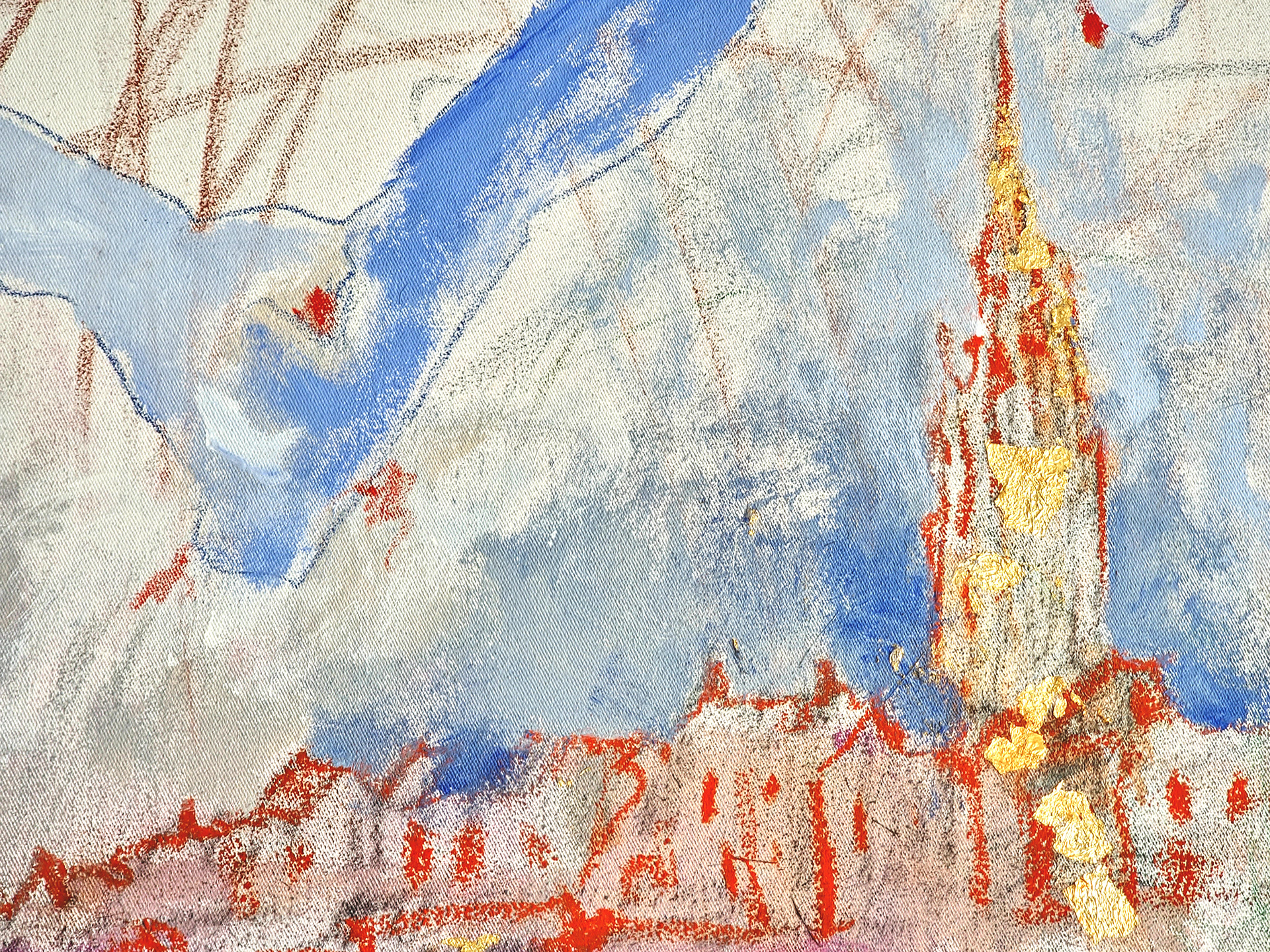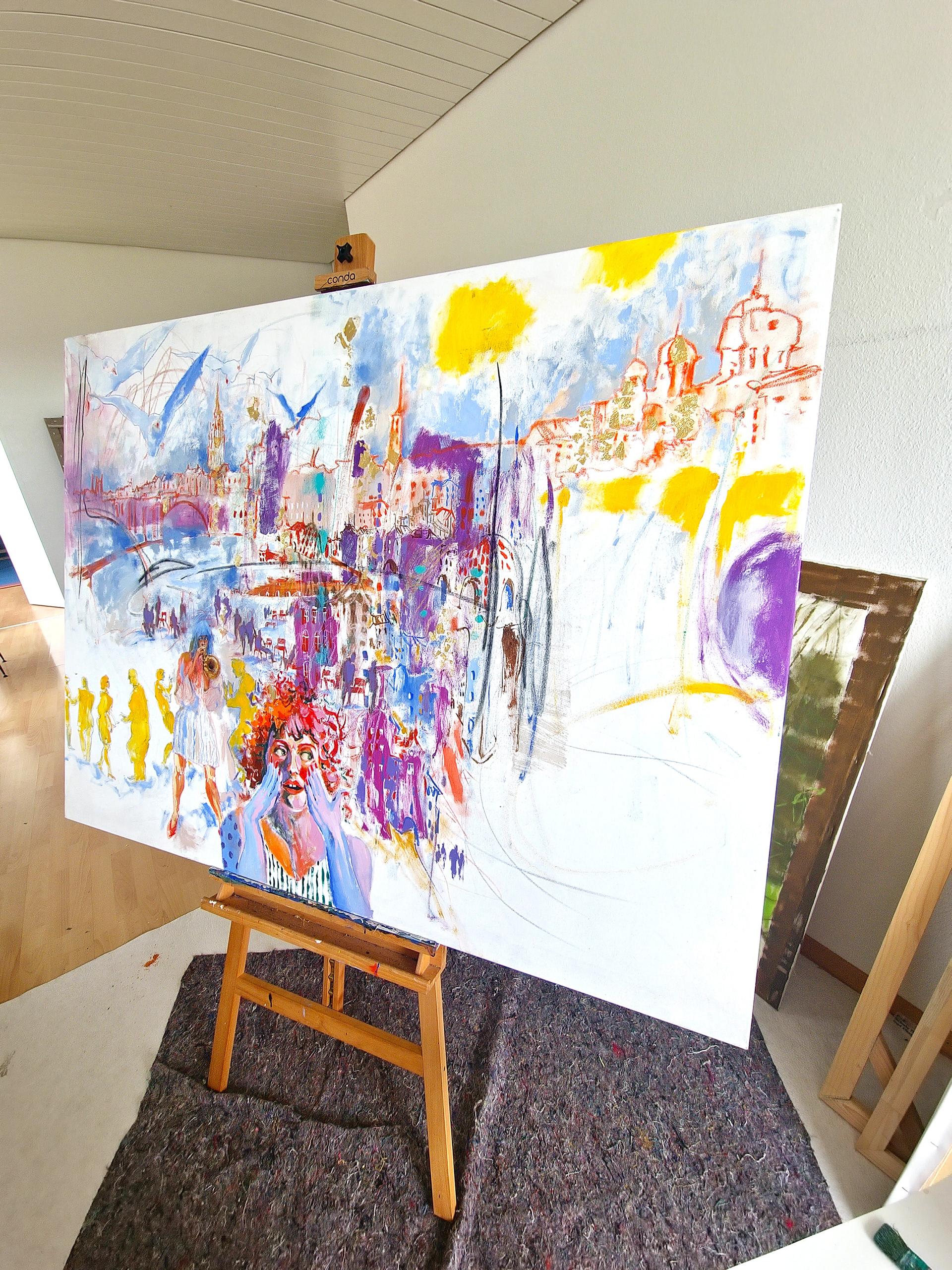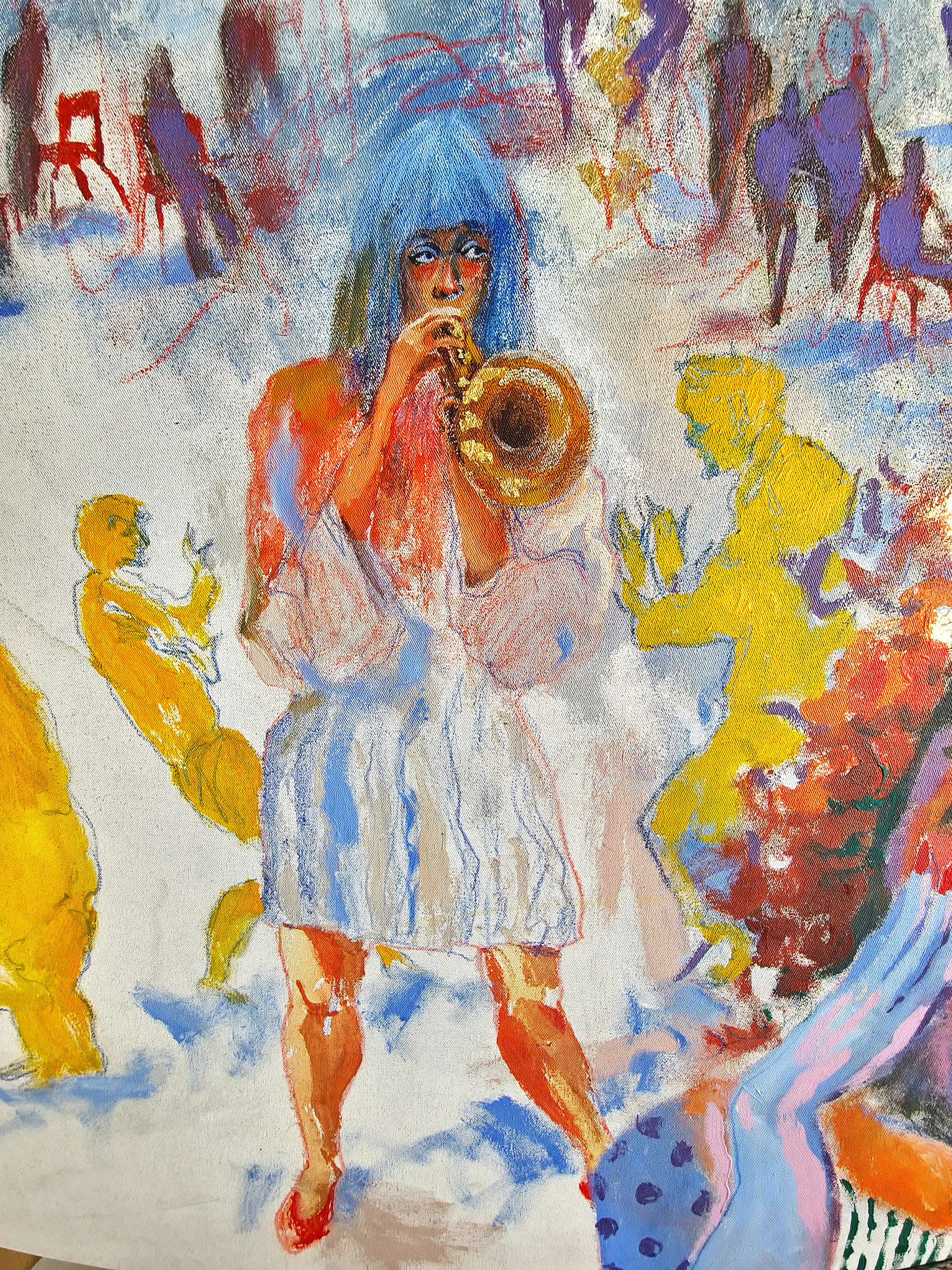 The image unfolds as a living field of movement, where architecture, sound, bodies, and air merge into one continuous flow. Lines remain open, colors vibrate, figures appear and dissolve, allowing the viewer to sense the process rather than a finished form.